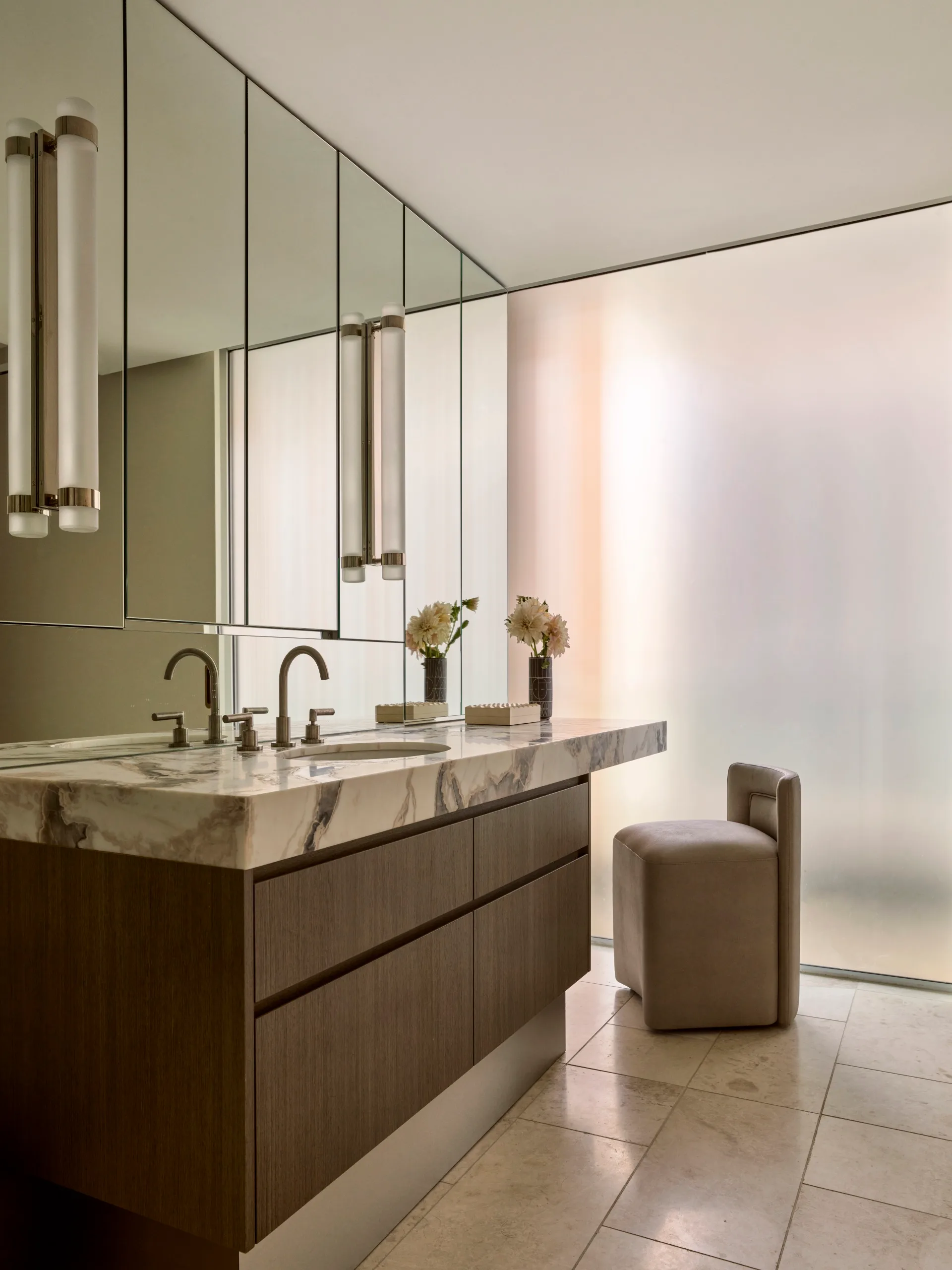 Laid throughout the guest bedroom is ‘Labrynth’ carpet from Tappeti. Curtains by Ian Frood in Lelievre ‘Camargue’; headboard in Dedar ‘Kiku’; and bed linen in Kohro ‘Gladio 2’, all from South Pacific Fabrics. Juniper ‘Thin’ task lamp from Enlightened Living. Chair in Great Plans ‘Eventide’ fabric from Holly Hunt. (Photography: Anson Smart | Styling: Thomas Hamel & Associates)The guest ensuite is lit by Visual Comfort ‘Barton’ sconces from Laura Kincade. Vanity in Bianco Orobico marble from Avant Stone and Naveneer Toscano Elm veneer from New Age Veneers. Brodware ‘City Plus’ basin set from Candana. Pietra Blanco flooring from Granite & Marble Works. (Photography: Anson Smart | Styling: Thomas Hamel & Associates)The powder room is a vision of Café Espresso marble and various flooring stones from Granite & Marble Works. Custom ‘Glyph’ wallpaper on raspberry silk from de Gournay. ‘Perfumer’ mirror from Studio Tashtego. Modernist plaster bust (after Modigliani) from Philip Stites Antiques. (Photography: Anson Smart | Styling: Thomas Hamel & Associates)