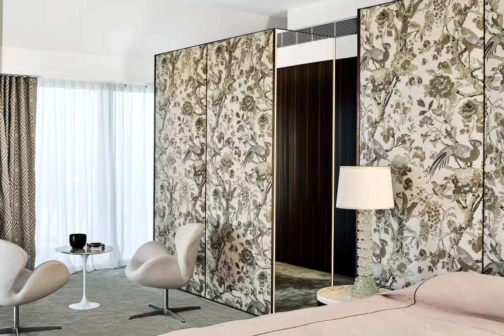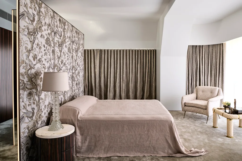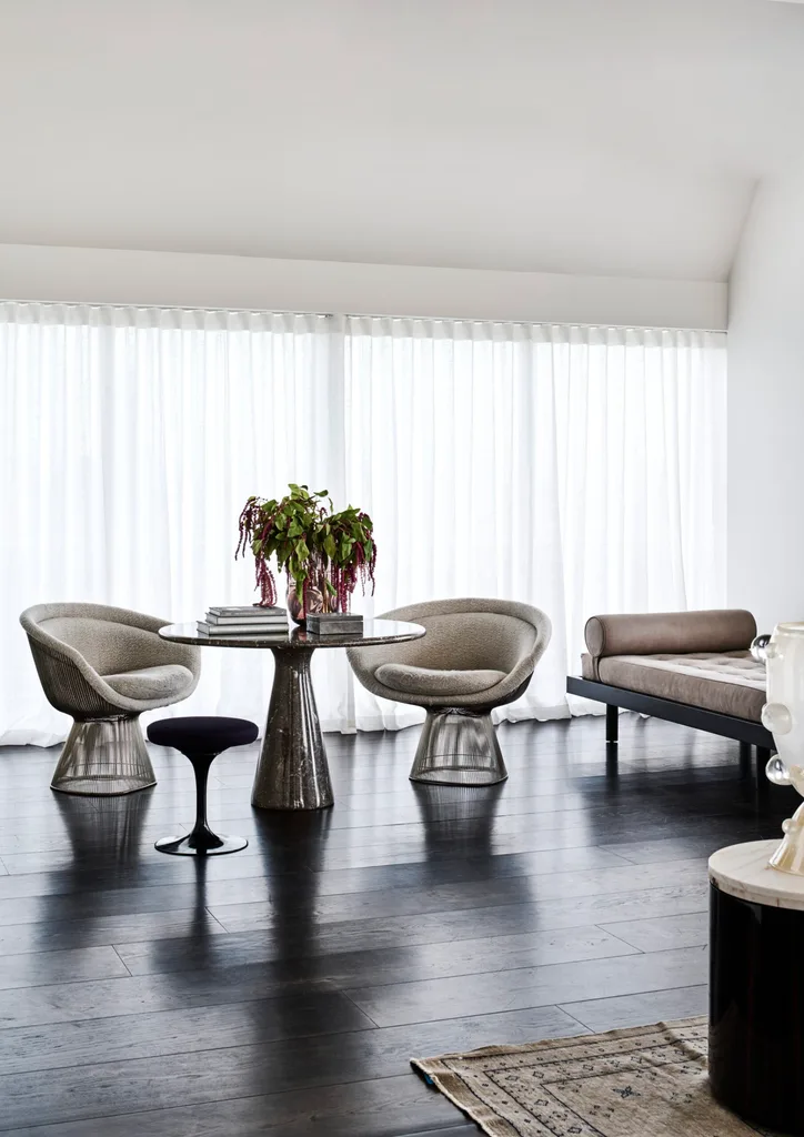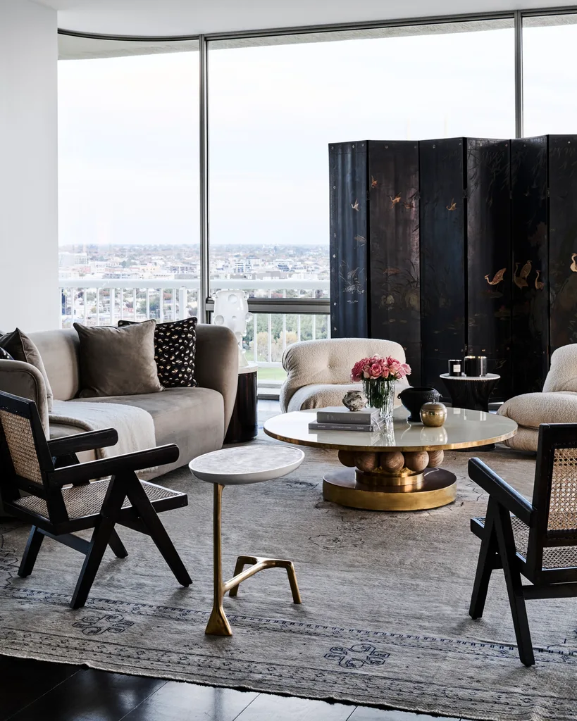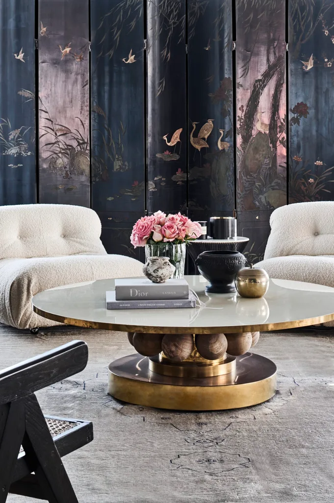 The designer chose many chic vintage Italian pieces for the project, including two signature Jeanneret rattan armchairs for Cassina and other standouts, including a marble and gilt coffee table, the beautiful antique Japanese screen and a silk oriental rug. “Combined, they make for a sumptuous edit of what the world has to offer,” he explains.