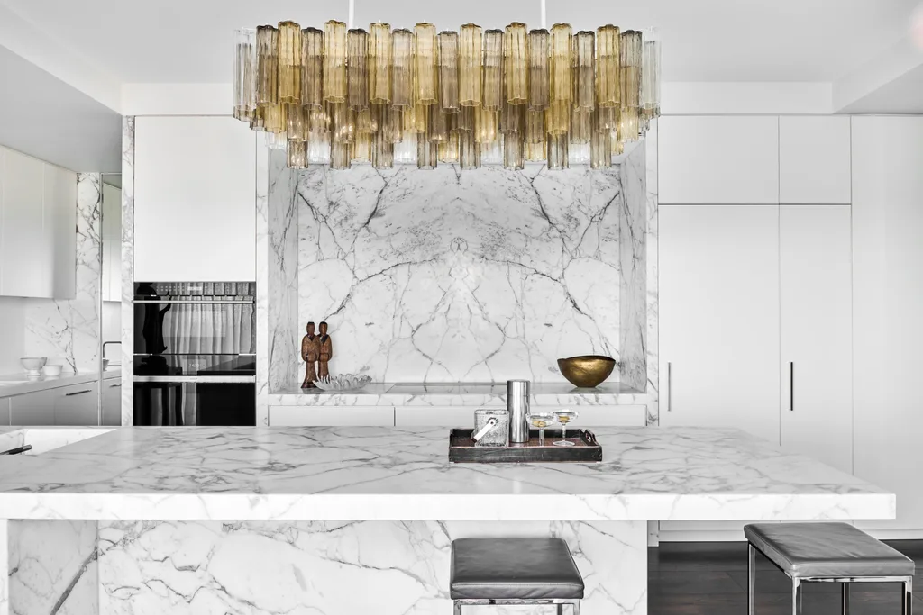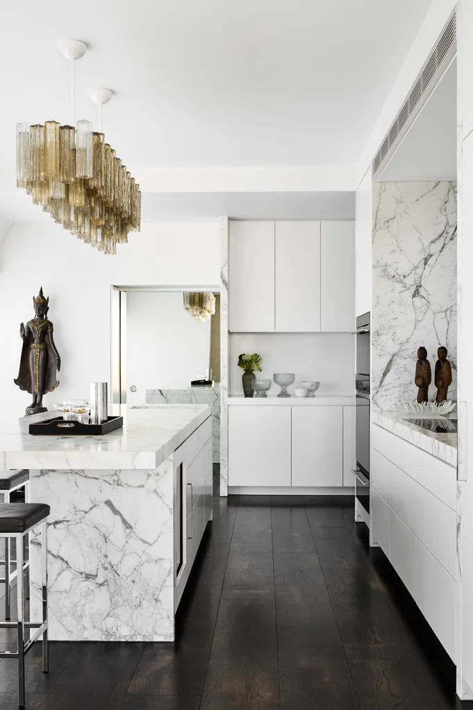 “The upholstered wall in the bedroom is beautiful as it contrasts with the modern interior and embellishes the decor,” says David. “So, too, does the large Murano chandelier that hovers over the kitchen island.”