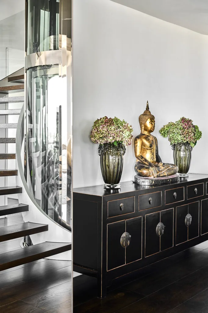 Strikingly, he also opened up the stair void to create a soaring atrium, where he placed the stairs and internal lift. “The owner wanted to open the spaces to create a grand penthouse with flowing but sectional rooms,” he says.
