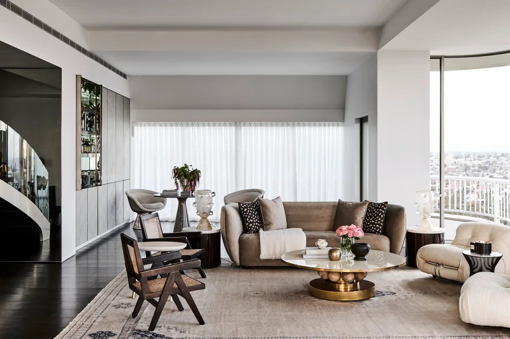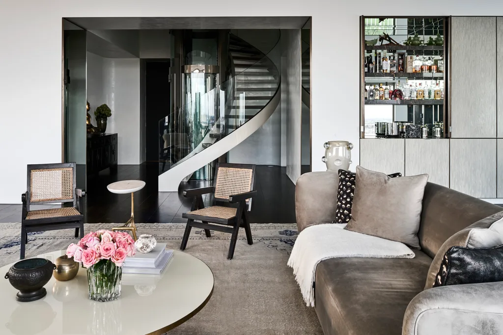 A sleek and sweeping spiral staircase, forged in steel and covered in glass, dramatically grounds this luminous penthouse in Melbourne. Poised within a 10-metre void, this spine of the home straddles the decades and symbolises its ethereal transformation.