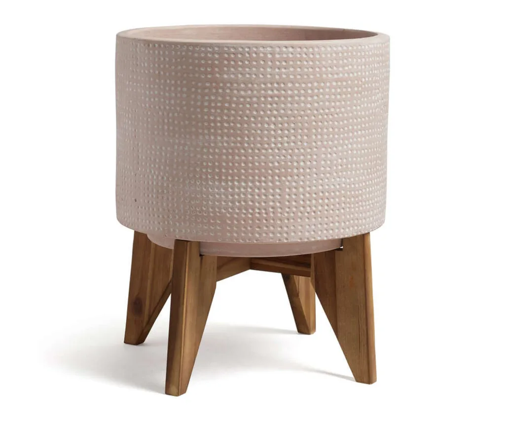 Sometimes you only need to elevate your plant slightly, especially when styling in a cluster of plants where it’s nice to have varying heights. For that, we can’t go past this textured ceramic planter with a sturdy wooden stand.