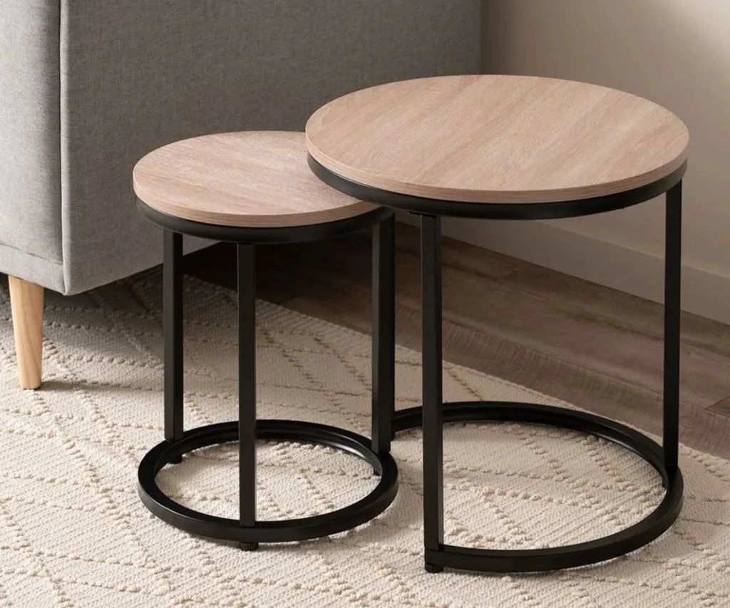 This set of round, nesting side tables offer a handy surface for your plants to thrive indoors. Place your potted plant on the larger side table and reserve the smaller nesting table for coffee or reading. The wood-grained finish contrasting to the sturdy black metal legs gives the tables a modern, sophisticated style that will easily translate to your home.