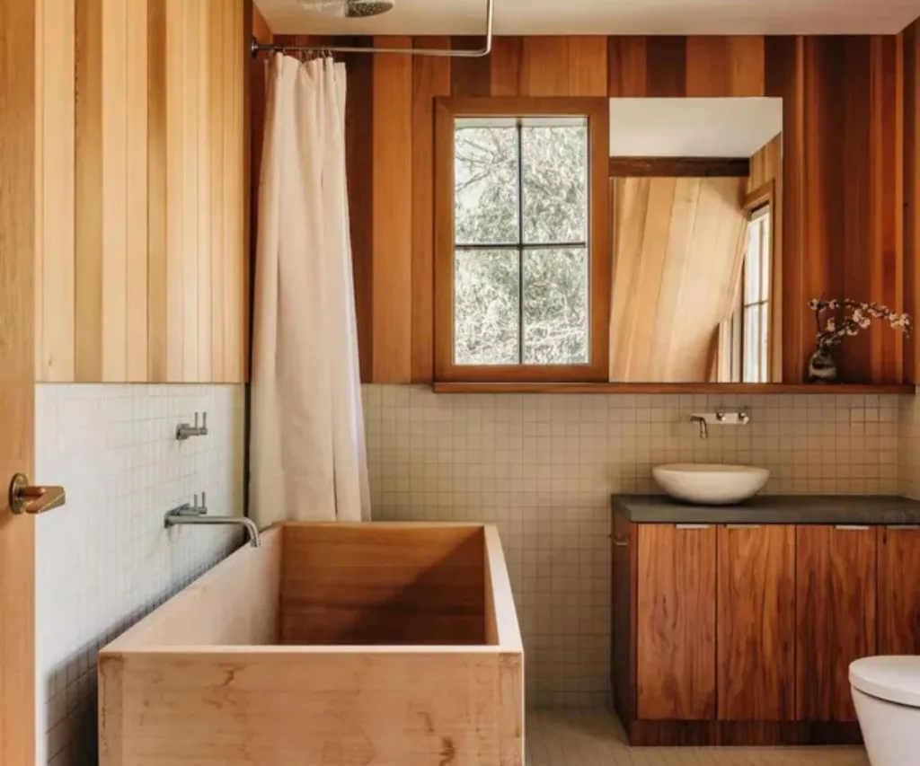 Embodying Japanese design and stocked with handmade ceramics and wares, the three-bedroom, three-storey chalet has a zen garden, sunken living room, Ryokan-inspired bathroom with a cedar bath, and views of a running river.